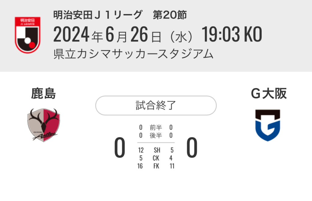1: 久太郎 ★ 2024/06/26(水) 21:04:18.99 ID:IEhjuzeB9 鹿島 0-0 G大阪 [得点者] なし スタジアム:県立カシマサッカースタジアム 入場者数:11,848人 https://www.jleague.jp/match/j1/2024/062601/live/#liveFC東京 1-0 札幌 [得点者] 84'安斎... -
