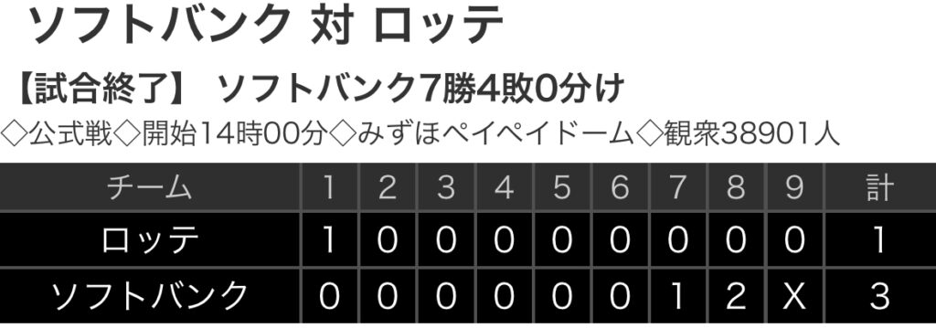 1: 鉄チーズ烏 ★ 2024/06/22(土) 16:35:30.45 ID:YSiRld5L9 ロッテ 1 0 0 0 0 0 0 0 0|1 ソフトバンク 0 0 0 0 0 0 1 2 x|3 【バッテリー】 (ロ)種市、国吉 - 佐藤 (ソ)大津、オスナ - 海野 【本塁打】 ... -