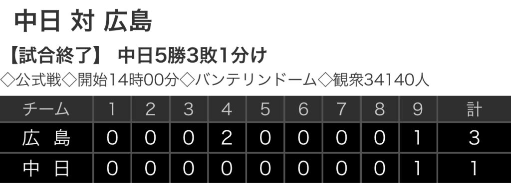 1: 鉄チーズ烏 ★ 2024/06/22(土) 17:06:49.30 ID:YSiRld5L9 広島 0 0 0 2 0 0 0 0 1 |3 中日 0 0 0 0 0 0 0 0 1 |1 【バッテリー】 (広)大瀬良、島内、栗林 - 會澤 (中)メヒア、橋本、齋藤、勝野 - 宇佐見 【本塁... -