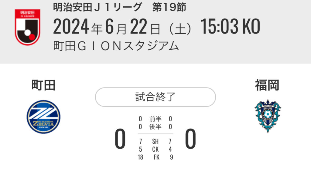1: 久太郎 ★ 2024/06/22(土) 17:01:02.18 ID:dNeZ1mZN9 町田 0-0 福岡 [得点者] なし スタジアム:町田GIONスタジアム 入場者数:9,092人 https://www.jleague.jp/match/j1/2024/062201/live/#live J1順位表 https://www.jleague.jp/standings/j1... -