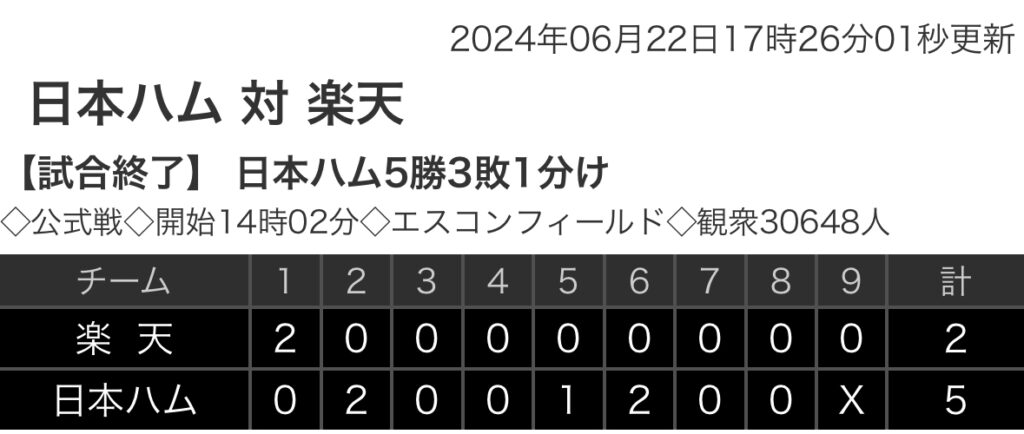 1: 鉄チーズ烏 ★ 2024/06/22(土) 17:18:09.31 ID:YSiRld5L9 楽天. 2 0 0 0 0 0 0 0 0|2 日本ハム 0 2 0 0 1 2 0 0 x|5 【バッテリー】 (楽)ポンセ、ターリー、津留﨑、弓削 - 太田、堀内 (日)伊藤、河野、... -