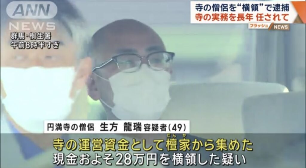 壇家から集めたお布施を横領した僧侶を逮捕 1000万円以上