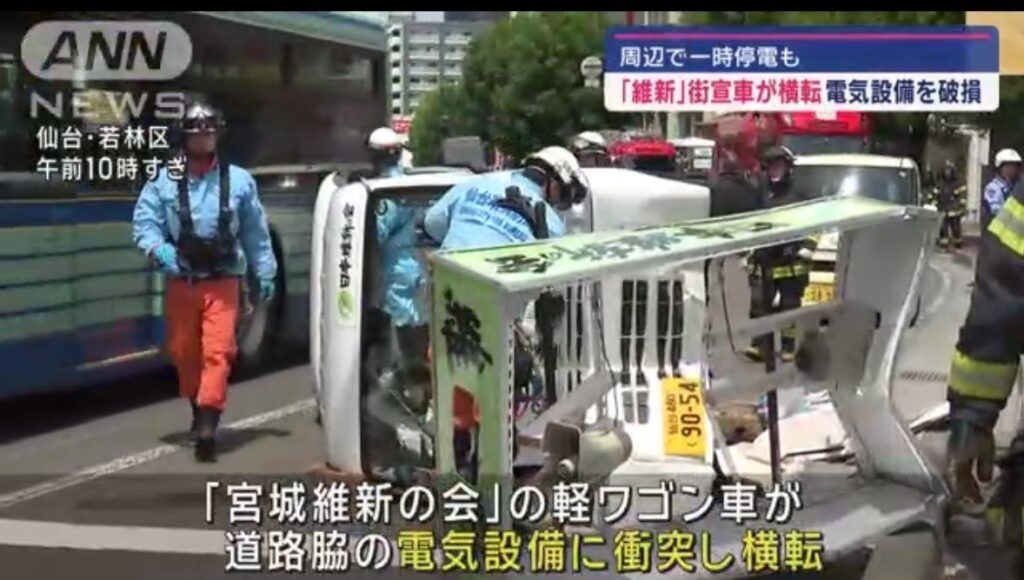 【宮城】「維新」街宣車が横転し電気設備を破損 周辺で一時停電も