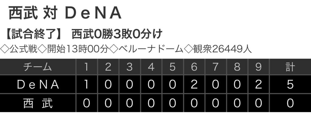 1: 鉄チーズ烏 ★ 2024/06/16(日) 16:04:40.02 ID:6KJUfoqI9 DeNA 1 0 0 0 0 2 0 0 2 |5 西武 0 0 0 0 0 0 0 0 0 |0 【バッテリー】 (De)石田裕 - 山本 (西) 渡邉、佐藤隼、本田、ヤン、松本、アブレイユ... -