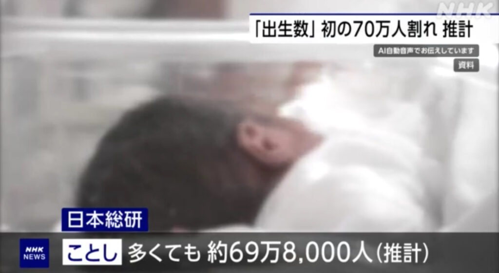 1: ぐれ ★ 2024/06/15(土) 19:26:22.38 ID:GOS7NGXI9 >>2024年6月15日 4時19分 NHK ことし1年間に生まれる日本人の子どもの数を示す「出生数」について、大手シンクタンク「日本総研」は、統計開始以降初めて70万人を下回るとする推計をまとめました... -
