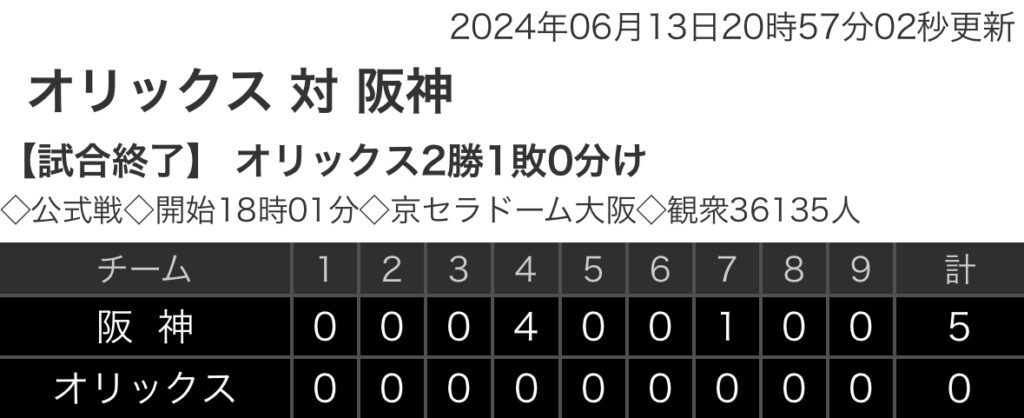 1: 鉄チーズ烏 ★ 2024/06/13(木) 20:48:44.08 ID:0idUARB99 阪神 0 0 0 4 0 0 1 0 0|5 オリックス. 0 0 0 0 0 0 0 0 0|0 【バッテリー】 (阪)西勇 - 梅野 (オ)田嶋、吉田、才木、鈴木 - 若月、福永 【本塁... -