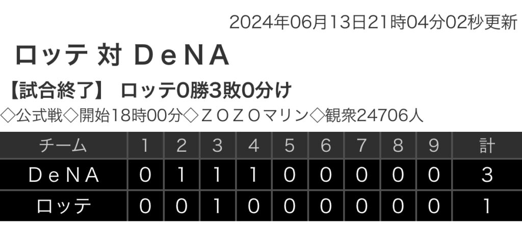 1: 鉄チーズ烏 ★ 2024/06/13(木) 20:51:42.23 ID:0idUARB99 DeNA. 0 1 1 1 0 0 0 0 0 |3 ロッテ 0 0 1 0 0 0 0 0 0 |1 【バッテリー】 (De)大貫、徳山、坂本、ウィック、森原 - 山本 (ロ) 西野、澤村、横山... -