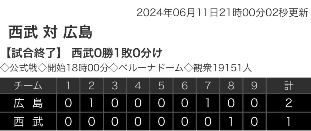 1: 鉄チーズ烏 ★ 2024/06/11(火) 20:47:11.09 ID:s6ToQ28+9 広島 0 1 0 0 0 0 1 0 0|2 西武 0 0 0 0 0 0 0 1 0|1 【バッテリー】 (広)床田、栗林 - 坂倉 (西)今井、ヤン、松本 - 古賀、柘植 【本塁打】 (広)菊... -