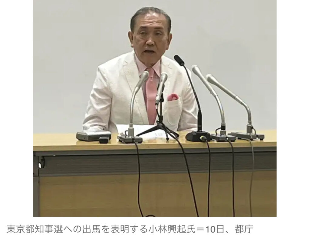 1: 樽悶 ★ 2024/06/11(火) 19:17:59.29 ID:gATLmnyd9 元衆院議員の小林興起氏(80)が10日、都庁で記者会見し、東京都知事選(20日告示、7月7日投開票)に無所属で出馬すると表明した。小池百合子知事の「3選阻止のために出馬する」と強調した。 ... -