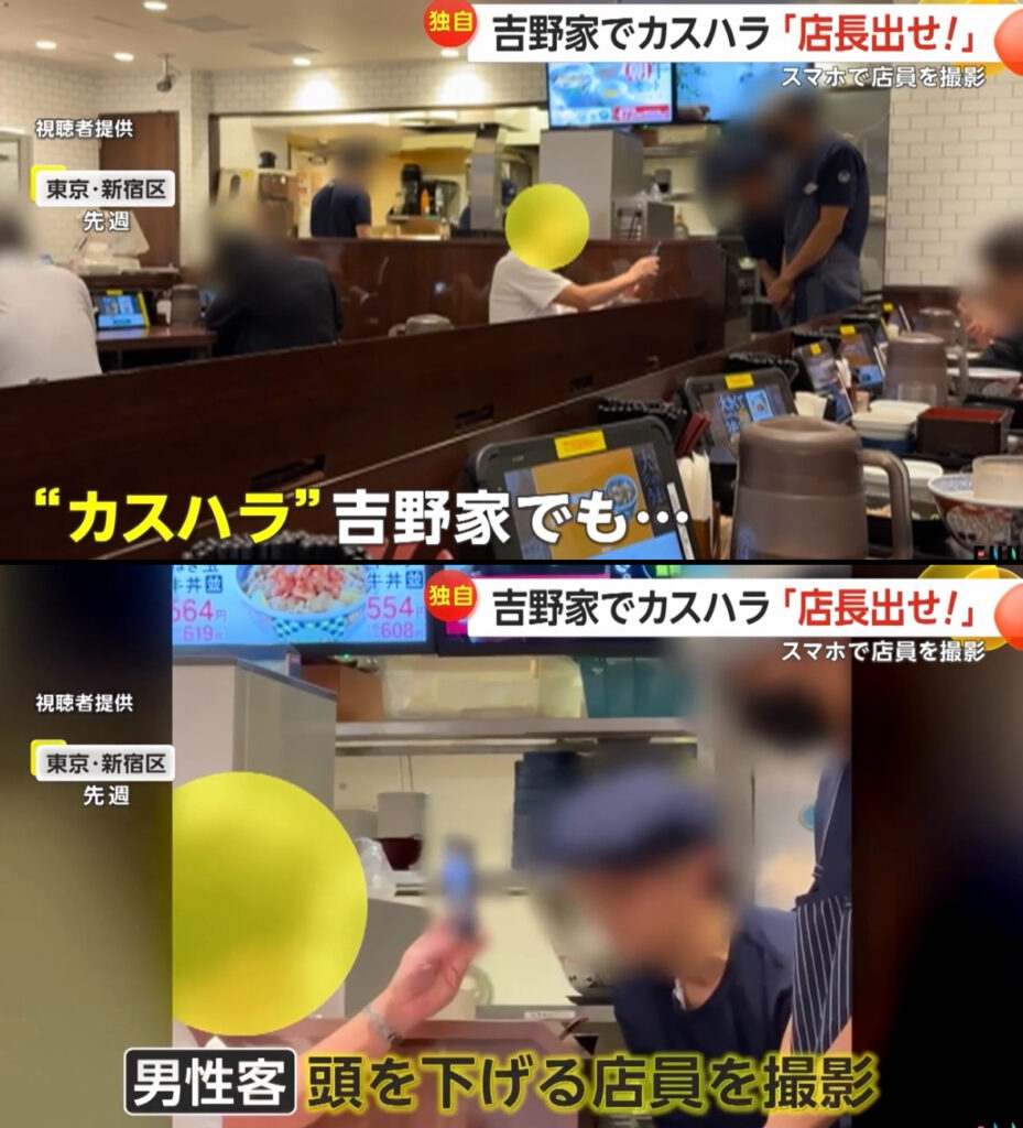 1: @シャチ ★ 警備員[Lv.23] 2024/06/10(月) 21:59:17.05 ID:VzV/r9tU9 先週、東京・新宿区にある吉野家の店舗で起きたカスタマーハラスメント、いわゆる“カスハラ”。 頭を下げる店員の姿をスマホで撮影する男性客。 トラブルのきっかけは、店がカレーラ... -