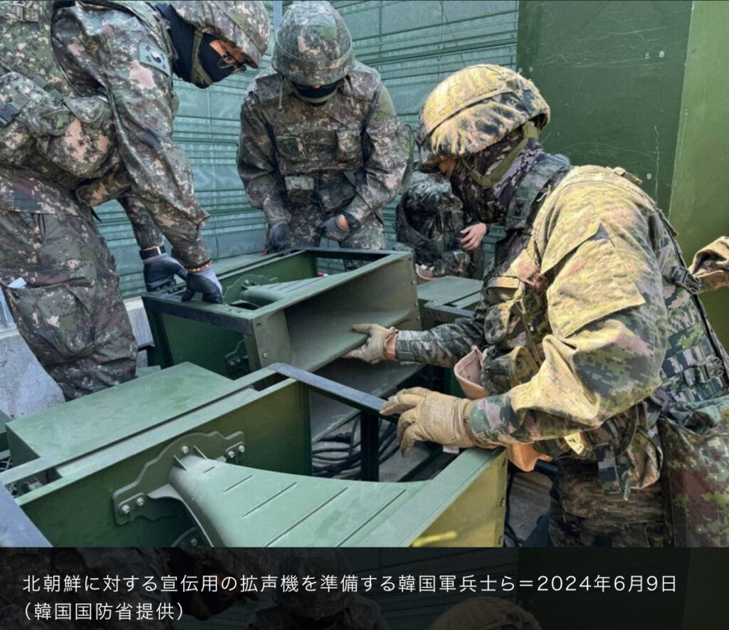 1: 朝一から閉店までφ ★ 2024/06/09(日) 23:11:51.15 ID:eld1RkeU 毎日新聞 2024/6/9 22:16(最終更新 6/9 22:16) 韓国軍は9日午後、南北の軍事境界線地域に設置した拡声機を使い、北朝鮮に対する宣伝放送を約6年ぶりに実施した。 北朝鮮が韓国に「ごみ... -