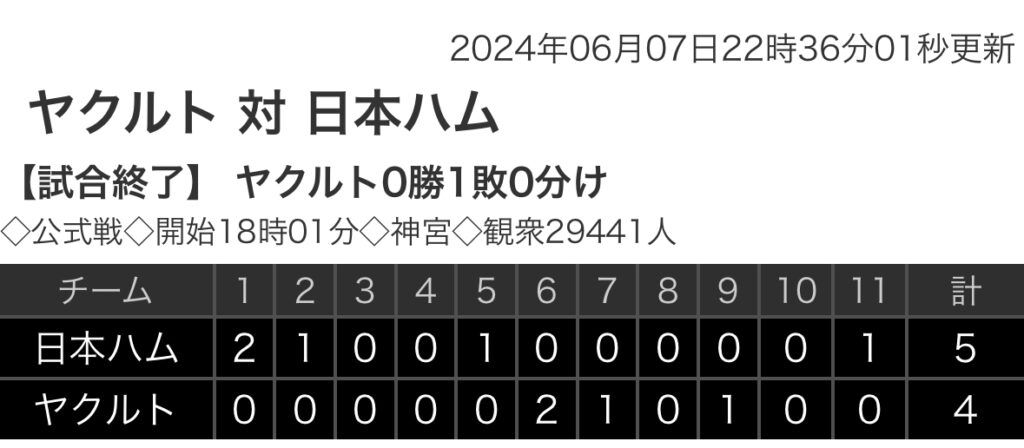 1: 鉄チーズ烏 ★ 2024/06/07(金) 22:35:34.48 ID:m2RbSHcV9 日本ハム 2 1 0 0 1 0 0 0 0 0 1 |5 ヤクルト..... 0 0 0 0 0 2 1 0 1 0 0 |4 【バッテリー】 (日)山﨑福也、田中正、河野、マーフィー、杉浦、矢... -