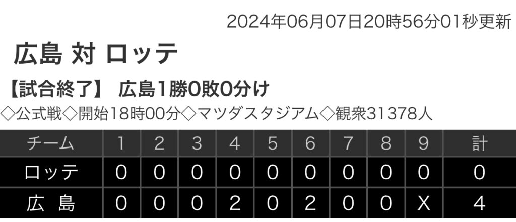 1: 鉄チーズ烏 ★ 2024/06/07(金) 20:55:12.19 ID:m2RbSHcV9 ロッテ 0 0 0 0 0 0 0 0 0|0 広島. 0 0 0 2 0 2 0 0 x|4 【バッテリー】 (ロ)美馬、横山、中村稔、東妻 - 佐藤 (広)大瀬良 - 會澤 【本塁打】 (ロ...