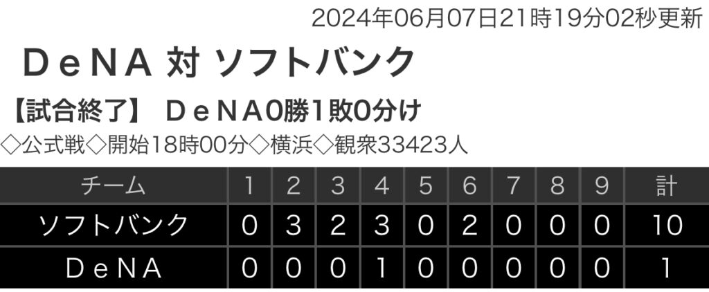 1: 鉄チーズ烏 ★ 2024/06/07(金) 21:18:47.86 ID:m2RbSHcV9 ソフトバンク 0 3 2 3 0 2 0 0 0 |10 DeNA. 0 0 0 1 0 0 0 0 0 | 1 【バッテリー】 (ソ) モイネロ、藤井 - 甲斐、嶺井 (De)森唯、上茶谷、宮... -