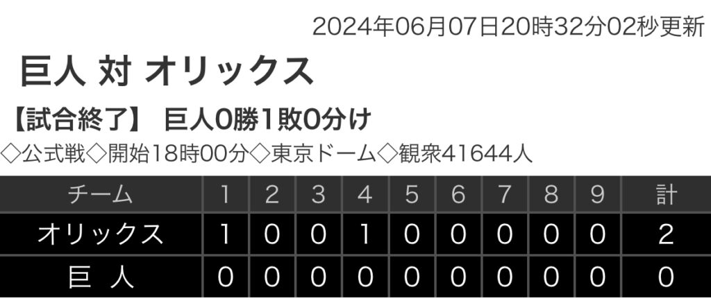 1: 鉄チーズ烏 ★ 2024/06/07(金) 20:23:27.37 ID:m2RbSHcV9 オリックス. 1 0 0 1 0 0 0 0 0|2 巨人 0 0 0 0 0 0 0 0 0|0 【バッテリー】 (オ)東、マチャド - 若月 (巨)戸郷、ケラー - 岸田 【本塁打】 (... -