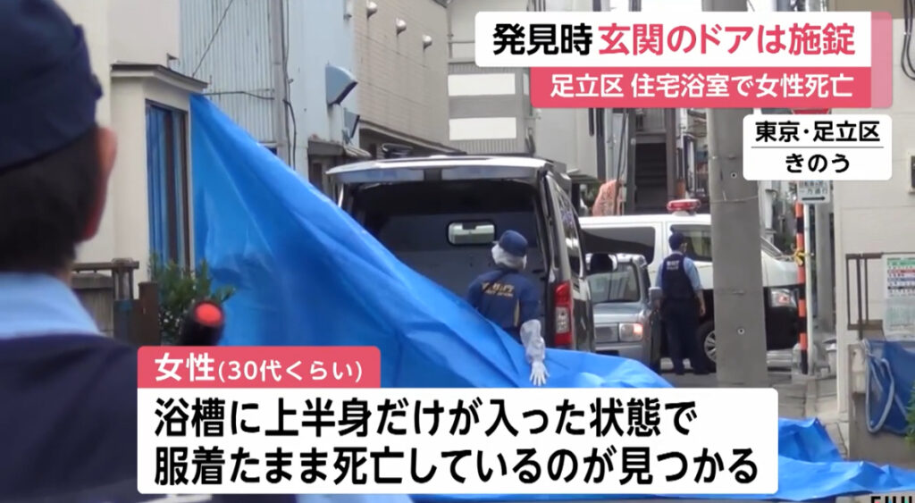 1: 夢みた土鍋 ★ 2024/06/07(金) 12:35:18.93 ID:??? TID:dreampot 東京・足立区で6日、浴室で死亡しているのが見つかった女性について、発見された際、玄関の鍵が閉まっていたことがわかりました。 6日、足立区関原の住宅で、30代くらいの女性が浴槽に上...