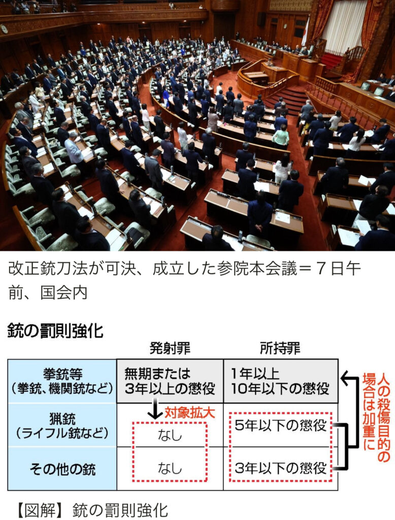 1: 香味焙煎 ★ 2024/06/07(金) 13:45:54.91 ID:PrmQ/sBU9 インターネット上に拳銃の製造方法を投稿し、不法所持を呼び掛けるなどのあおり行為を罰則付きで禁止する改正銃刀法が7日の参院本会議で可決、成立した。7月中に施行される。安倍晋三元首相銃... -