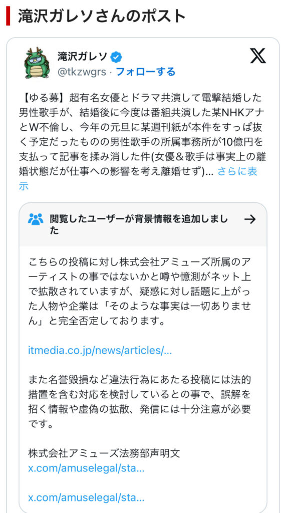 1: jinjin ★ 2024/06/07(金) 01:08:08.41 ID:j0q7J7Ua9 滝沢ガレソ、星野源をめぐる臆測投稿で物議…「デマ」を流すとどんな罪に問われるのか【弁護士が解説】 炎上案件などのまとめ投稿を発信する滝沢ガレソさんのポストが議論を呼んでいます。 内容は「超... -