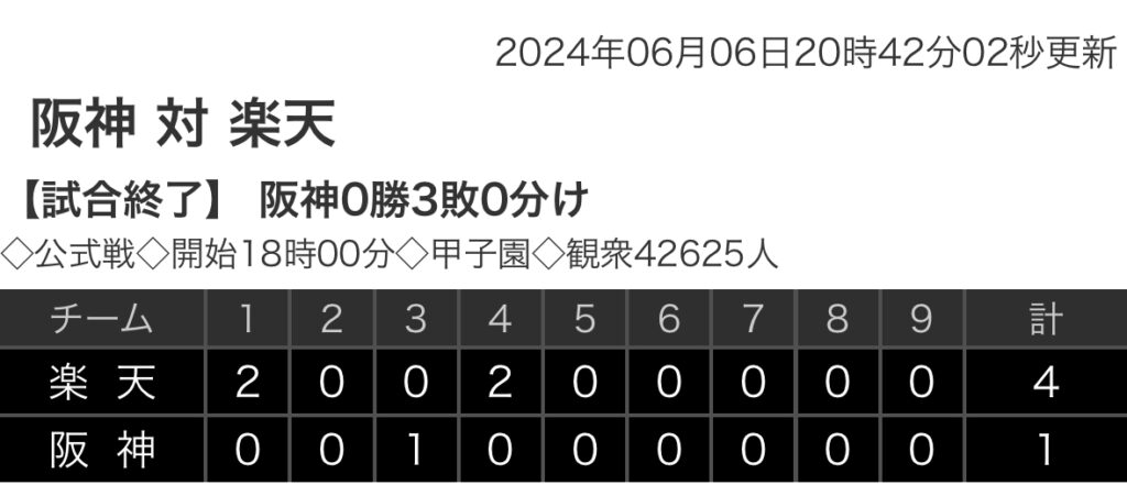 1: 鉄チーズ烏 ★ 2024/06/06(木) 20:33:24.73 ID:NuvJ+AQJ9 楽天 2 0 0 2 0 0 0 0 0|4 阪神 0 0 1 0 0 0 0 0 0|1 【バッテリー】 (楽)藤井、宋家豪、鈴木翔 - 太田 (阪)西勇、富田、浜地 - 梅野 【本塁打】 (楽... -
