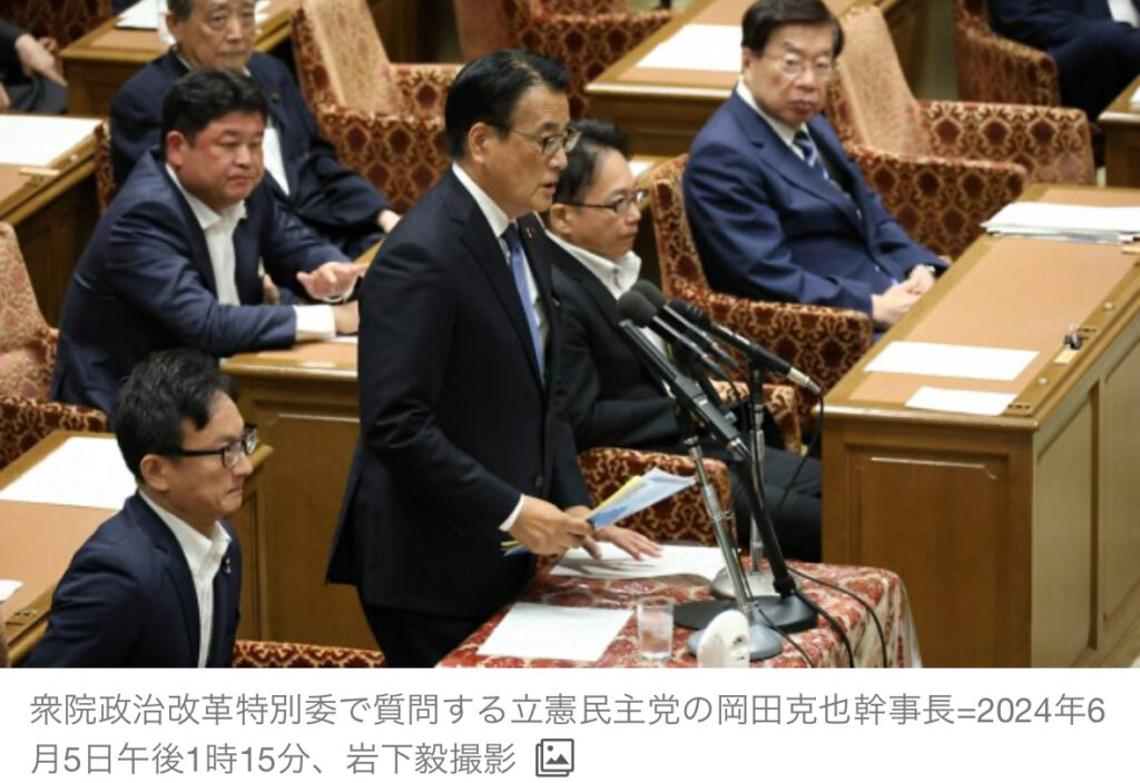 1: 蚤の市 ★ 2024/06/05(水) 21:47:28.10 ID:JbqXTqyb9 5日の衆院政治改革特別委員会で、立憲民主党の岡田克也幹事長が質問に立った。岸田文雄首相との直接対決は最大の見せ場だが、自身の政治資金パーティーへの対応で批判を浴びた岡田氏の登板に、立憲...