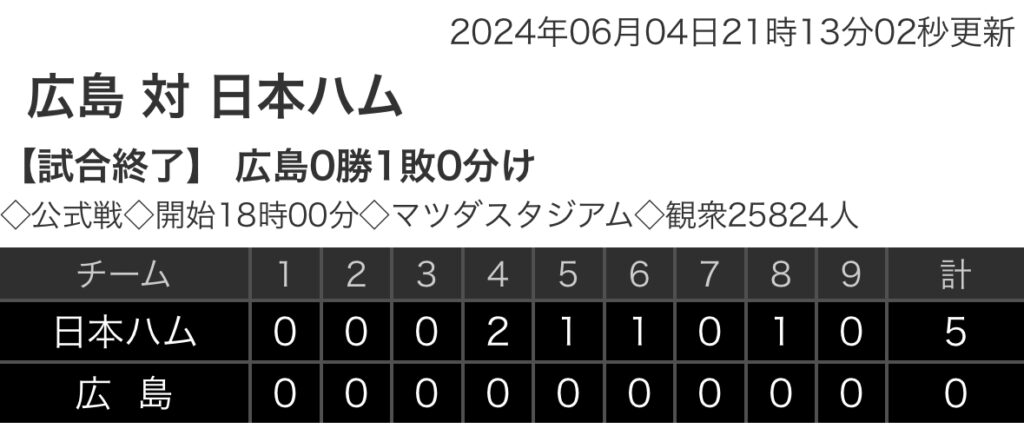 1: 鉄チーズ烏 ★ 2024/06/04(火) 21:03:34.55 ID:wxPLNN8x9 日本ハム.. 0 0 0 2 1 1 0 1 0|5 広島 0 0 0 0 0 0 0 0 0|0 【バッテリー】 (日)北山、田中正、ザバラ、河野、畔柳、生田目 - 田宮 (広)床田、黒... -