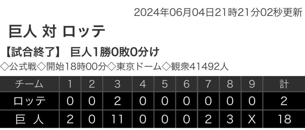 1: 鉄チーズ烏 ★ 2024/06/04(火) 21:19:41.64 ID:wxPLNN8x9 ロッテ 0 0 2 0 0 0 0 0 0| 2 巨人. 2 0 11 0 0 0 2 3 0|18 【バッテリー】 (ロ)小島、二保、国吉、吉田 - 佐藤、柿沼 (巨)山﨑伊、平内、ケラー... -