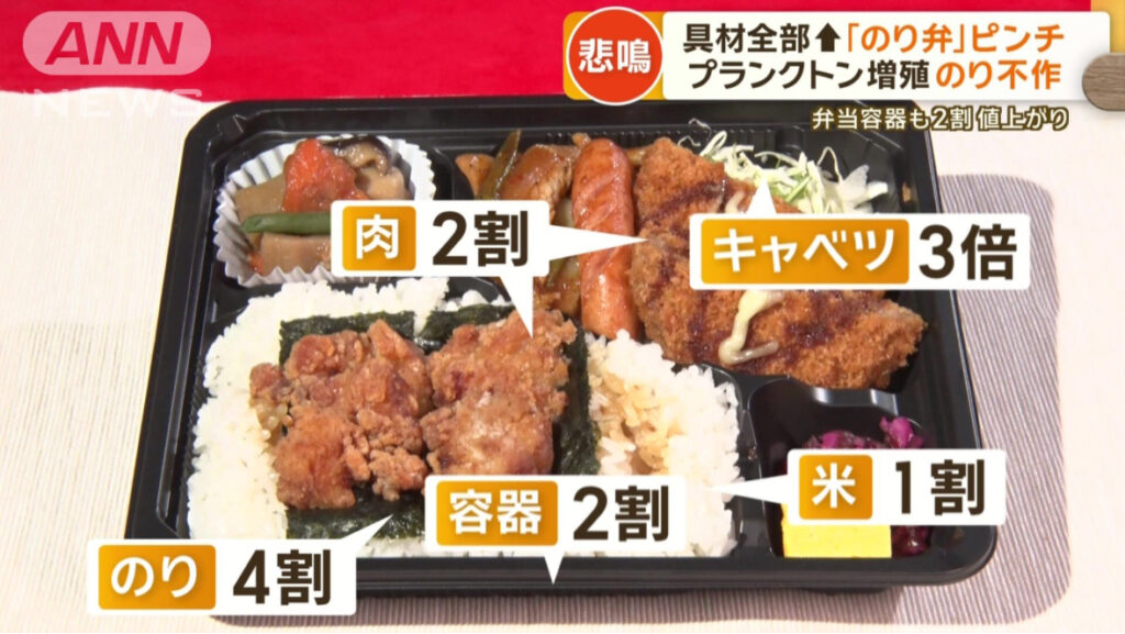 1: Gecko ★ 2024/06/04(火) 15:56:27.20 ID:XL4Kc4Pl9 ★のり弁“400円の壁”突破 のり不作で苦渋の値上げ 原材料費↑で「いたちごっこ」 町のお弁当屋さんが具材の値上げでピンチです。「のり弁」になくてはならない「のり」も4割値上がりし、400円の壁を超... -