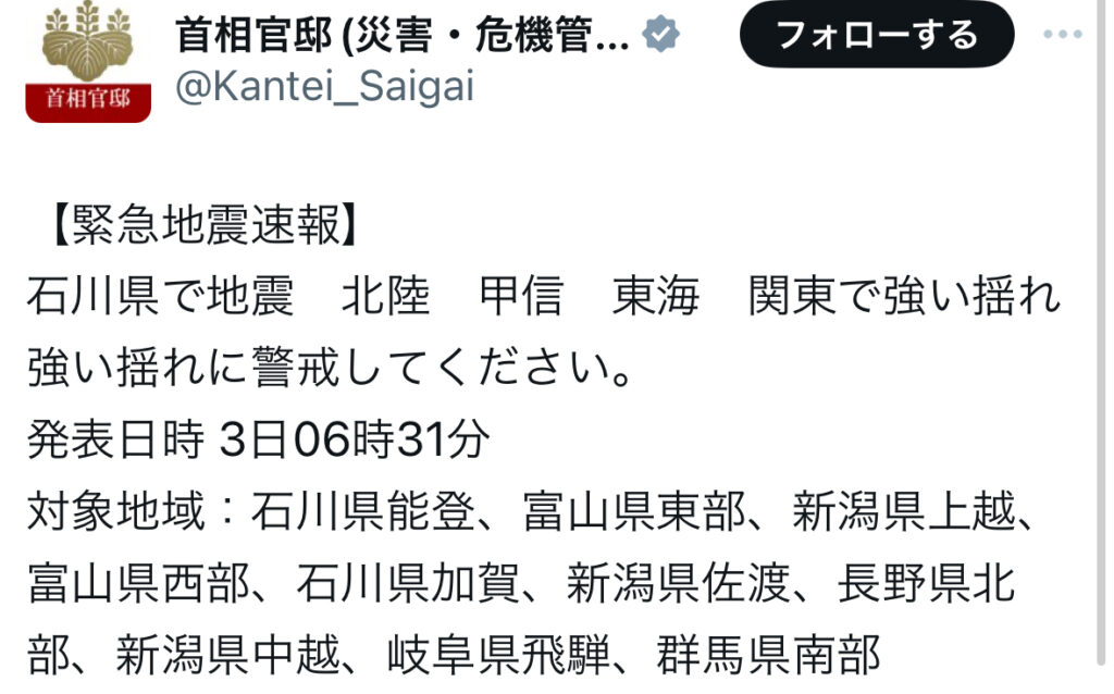 1: 少考さん ★ 2024/06/03(月) 06:34:06.01 ID:HTqYXcwN9 首相官邸(災害・危機管理情報) @Kantei_Saigai 【緊急地震速報】 石川県で地震 北陸 甲信 東海 関東で強い揺れ 強い揺れに警戒してください。 発表日時 3日06時31分 対象地域:石川県能登、富... -