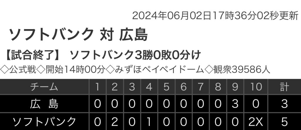 1: 鉄チーズ烏 ★ 2024/06/02(日) 17:40:36.81 ID:oiSeQ2C79 広島. 0 0 0 0 0 0 0 0 3 0 |3 ソフトバンク 0 2 0 1 0 0 0 0 0 2x|5 【バッテリー】 (広)アドゥワ、塹江、森浦、栗林、島内 - 石原 (ソ... -