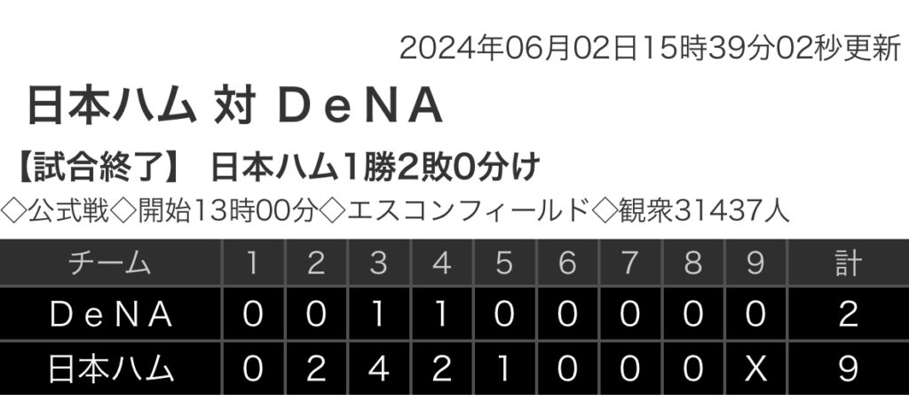 1: 鉄チーズ烏 ★ 2024/06/02(日) 15:40:11.75 ID:oiSeQ2C79 DeNA 0 0 1 1 0 0 0 0 0|2 日本ハム. 0 2 4 2 1 0 0 0 x|9 【バッテリー】 (De)大貫、上茶谷、京山 - 山本 (日) 福島、矢澤、ザバラ - 田宮、...