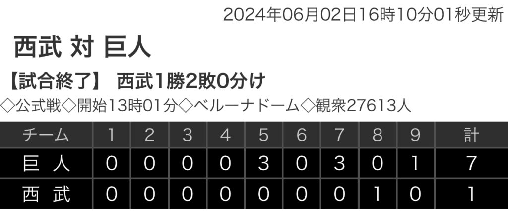 1: 鉄チーズ烏 ★ 2024/06/02(日) 16:07:47.00 ID:oiSeQ2C79 巨人 0 0 0 0 3 0 3 0 1 |7 西武 0 0 0 0 0 0 0 1 0 |1 【バッテリー】 (巨)菅野、今村、ケラー - 小林 (西)ボー・タカハシ、中村祐、佐藤隼、豆田、與... -
