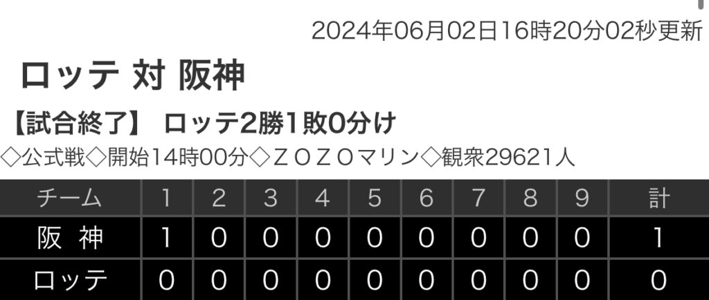 1: 鉄チーズ烏 ★ 2024/06/02(日) 16:18:06.80 ID:oiSeQ2C79 阪神. 1 0 0 0 0 0 0 0 0|1 ロッテ 0 0 0 0 0 0 0 0 0|0 【バッテリー】 (阪)才木 - 梅野 (ロ)メルセデス、吉田 - 佐藤、柿沼【本塁打】 (阪)森下6号... -