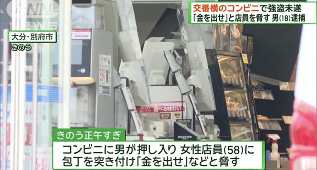 1: モフモフちゃん ★ 2024/06/02(日) 06:57:03.64 ID:TUAPZTFm9 交番横のコンビニで強盗未遂 18歳の男逮捕 テレビ朝日系(ANN)6/2(日) 6:44配信 https://news.yahoo.co.jp/articles/637771cf8d76ec9eb9e28cb359da437db4ba792d 大分県別府市のコンビニ店... -
