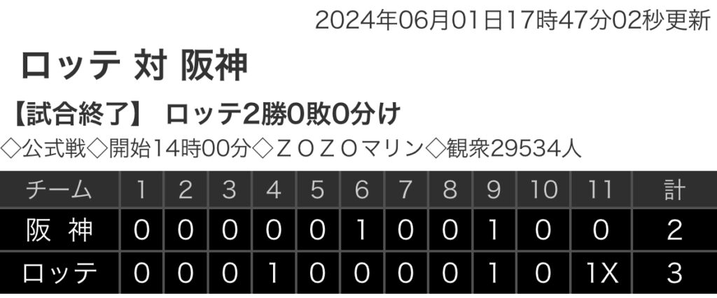 1: 鉄チーズ烏 ★ 2024/06/01(土) 17:49:12.31 ID:ysmYk4N89 阪神. 0 0 0 0 0 1 0 0 1 0 0 |2 ロッテ 0 0 0 1 0 0 0 0 1 0 1 x|3 【バッテリー】 (阪)ビーズリー、石井、桐敷、岩崎、西純 - 梅野 (ロ...