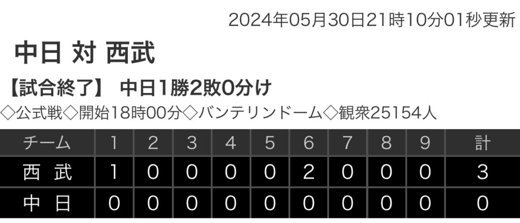 1: 鉄チーズ烏 ★ 2024/05/30(木) 21:08:17.00 ID:k43Sned/9 西武 1 0 0 0 0 2 0 0 0 |3 中日 0 0 0 0 0 0 0 0 0 |0 【バッテリー】 (西)武内、平井、佐藤隼、松本、アブレイユ - 炭谷 (中)柳、勝野、梅野、齋藤 -... -