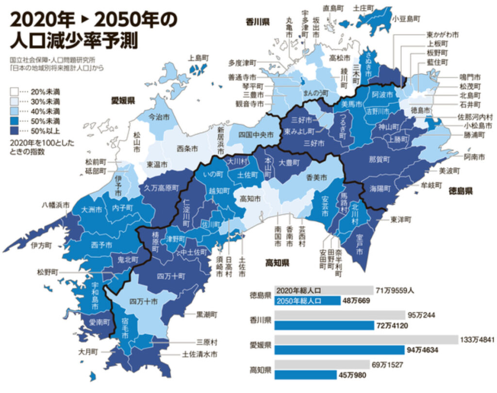 1: 蚤の市 ★ ころころ 2024/05/30(木) 15:35:05.72 ID:1j2Lpq1F9 人口減少が地域社会の存続に危機的な影響を与えつつある。 厚生労働省の調査機関「国立社会保障・人口問題研究所」が昨年末に発表した2020年から50年の予測によると、四国4県の人口減少... -