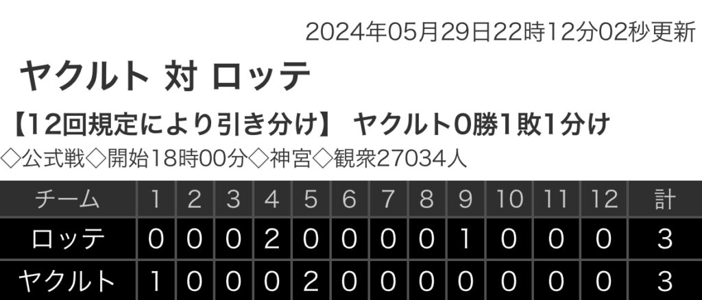 【野球】交流戦 S 3-3 M [5/29] ヤクルト-ロッテはエン12回引き分け 9回ロッテがポランコのタイムリーで追いつく