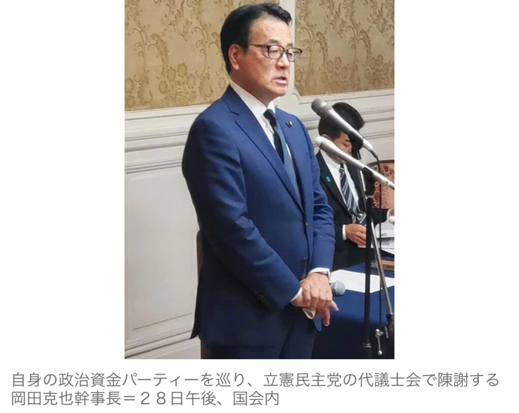 1: 香味焙煎 ★ 2024/05/28(火) 16:15:00.34 ID:HK8hrCO09 立憲民主党の小沢一郎衆院議員は28日、同党が政治資金パーティー禁止法案を衆院に提出しながら一部幹部がパーティー開催を計画していた問題について、「頭がおかしいのではないか。法案を出した... -