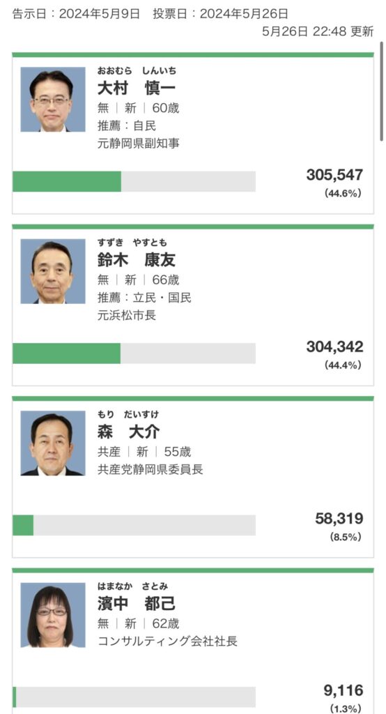 1: 名無しさん@涙目です。(みかか) [ニダ] 2024/05/26(日) 20:04:25.44 ID:5eytVHD00● BE:156193805-PLT(16500) sssp://img.5ch.net/ico/monaazarashi_1.gif NHK https://www3.nhk.or.jp/senkyo2/shizuoka/20617/skh54961.html 引用元: ・静岡県知事選挙 ... -