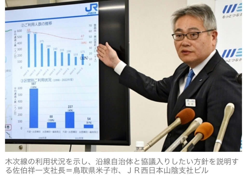 1: 名無しさん@涙目です。(東京都) [TR] 2024/05/26(日) 07:34:06.18 ID:A4W6Lhu40● BE:509689741-2BP(6000) sssp://img.5ch.net/ico/1fu.gif 「木次線在り方」JR西、唐突な意向表明…沿線自治体への連絡は会見当日午前 鉄路の行方は“白紙”強調も、島根... -