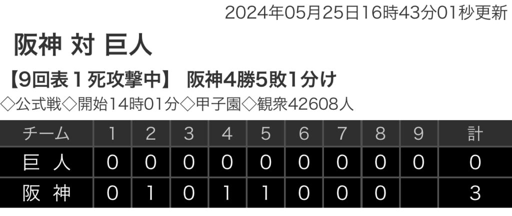 1: 鉄チーズ烏 ★ 2024/05/25(土) 16:38:32.41 ID:je4R2iYv9 巨人 0 0 0 0 0 0 0 0 0 |0 阪神 0 1 0 1 1 0 0 0 x |3 【バッテリー】 (巨)赤星、井上、大江、ケラー - 岸田 (阪)ビーズリー、石井、岩崎、ゲラ - 梅...
