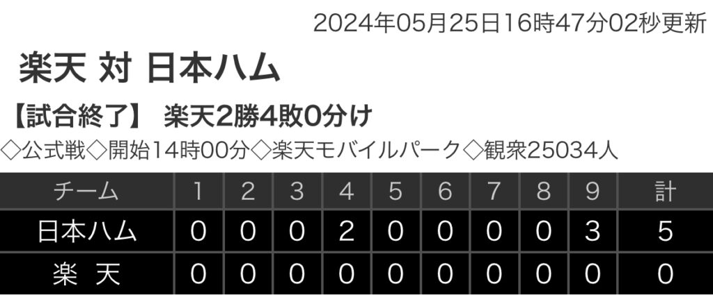 【野球】パ・リーグ E 0-5 F [5/25] 日本ハム連勝 加藤貴之101球完封勝利 松本剛先制打、万波追加点 楽天ドラ1古謝6回2失点も無援護