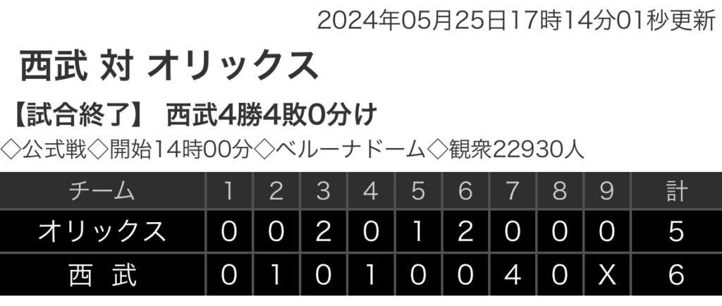 1: 鉄チーズ烏 ★ 2024/05/25(土) 17:12:23.45 ID:je4R2iYv9 オリックス. 0 0 2 0 1 2 0 0 0|5 西武 0 1 0 1 0 0 4 0 x|6 【バッテリー】 (オ)曽谷、井口、山﨑 - 若月 (西)渡邉、田村、與座、平井、アブレ... -