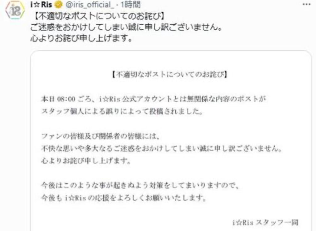 1: Ailuropoda melanoleuca ★ 2024/05/23(木) 13:35:48.16 ID:CLSbhfRw9 2024年5月23日12時55分 アイドルグループi☆Ris(アイリス)の公式X(旧ツイッター)が23日、不適切な投稿について謝罪した。 【不適切なポストについてのお詫び】とし、「本日8:00... -