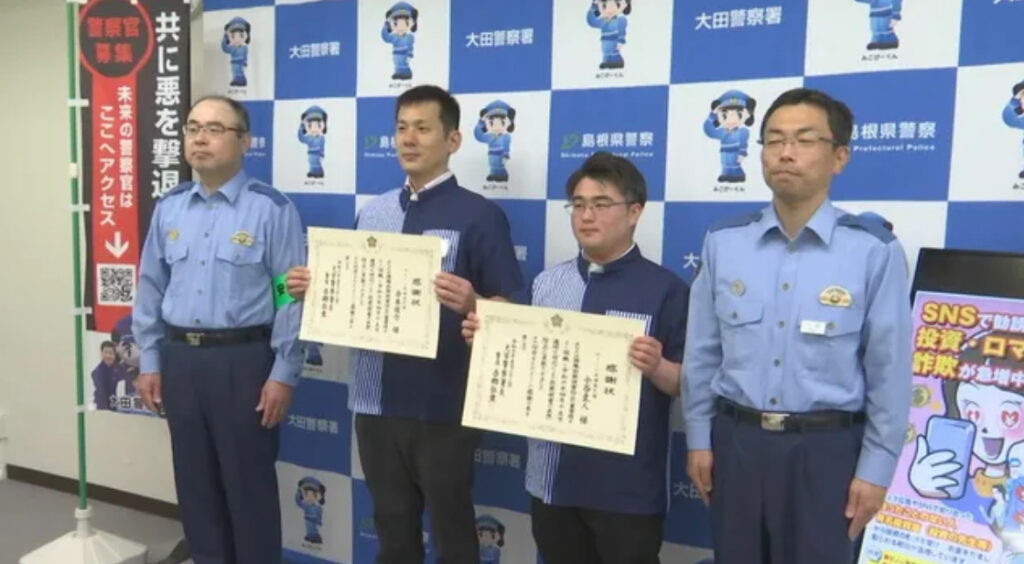 1: ばぐっち ★ 2024/05/23(木) 07:17:42.45 ID:??? TID:BUGTA SNSで著名人を名乗った投資詐欺を未然に防いだとして22日、島根県大田市内のコンビニ店員2人に警察から感謝状が贈られました。 2人は詐欺だと客を説得するも、なかなか応じてもらえなかったと...