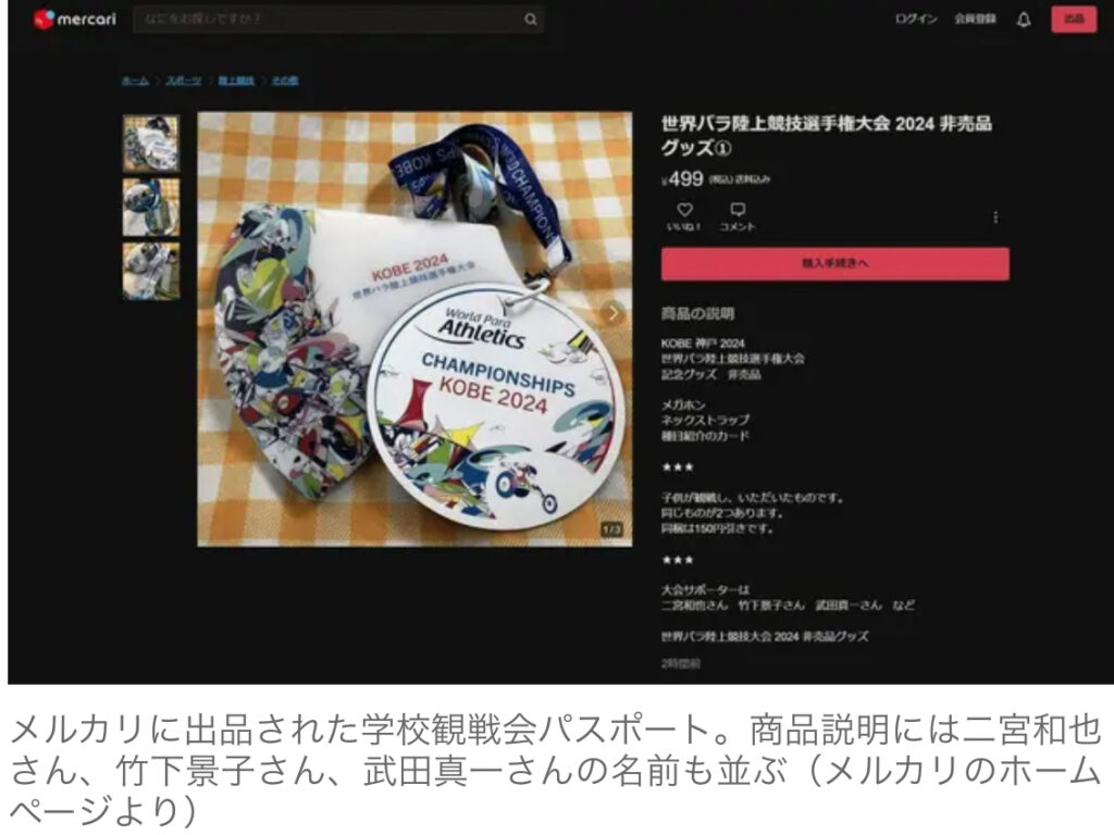 1: TUBASA ★ 2024/05/22(水) 22:49:52.51 ID:??? TID:TUBASA 神戸市で開催中のパラ陸上の世界選手権で、兵庫県内の小中学校、高校、特別支援学校の児童、生徒、教員らを無料招待する学校観戦会用のパスポートが、フリーマーケットアプリ「メルカリ」に複数... -