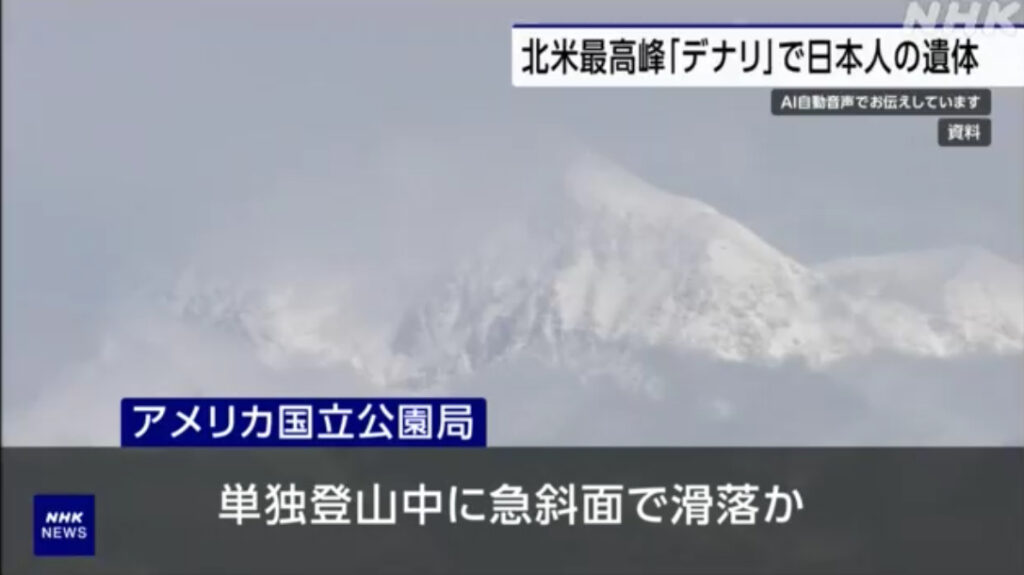 1: 牛乳トースト ★ 2024/05/22(水) 22:01:04.74 ID:c8I+60sG9 アメリカのアラスカ州にある北アメリカ大陸最高峰の「デナリ」、かつて「マッキンリー」と呼ばれた山で、札幌市の日本人男性が遺体でみつかり、一帯を管理する国立公園局は登山中に滑落したと... -