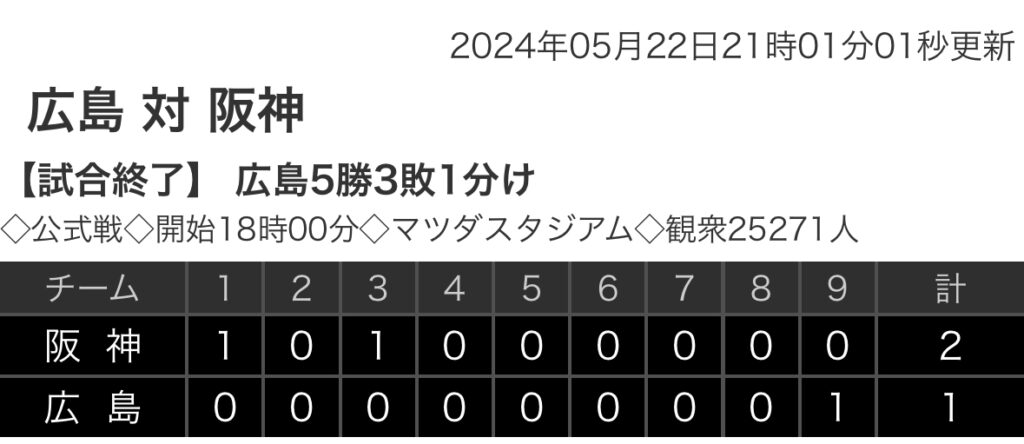 1: 鉄チーズ烏 ★ 2024/05/22(水) 21:00:42.61 ID:+7h4PGXl9 阪神 1 0 1 0 0 0 0 0 0 |2 広島 0 0 0 0 0 0 0 0 1 |1 【バッテリー】 (阪)大竹、桐敷、岩崎 - 坂本 (広)森下、森浦、塹江 - 會澤、石原 【本塁打】 ...