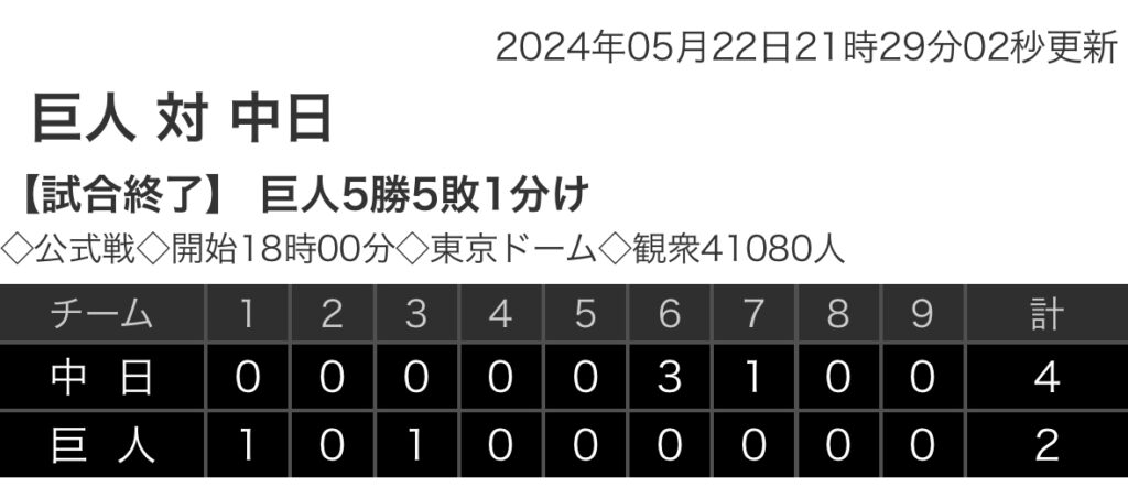 1: 鉄チーズ烏 ★ 2024/05/22(水) 21:17:30.58 ID:+7h4PGXl9 中日 0 0 0 0 0 3 1 0 0 |4 巨人 1 0 1 0 0 0 0 0 0 |2 【バッテリー】 (中)小笠原、藤嶋、マルティネス - 加藤匠 (巨)堀田、泉、大江、馬場、ケラー、... -