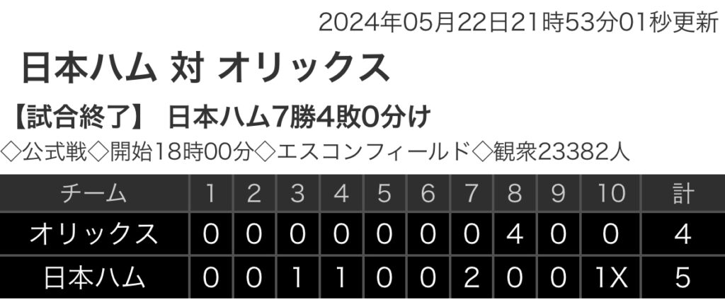 1: 鉄チーズ烏 ★ 2024/05/22(水) 21:51:45.44 ID:+7h4PGXl9 オリックス. 0 0 0 0 0 0 0 4 0 0 |4 日本ハム 0 0 1 1 0 0 2 0 0 1x|5 【バッテリー】 (オ)カスティーヨ、鈴木、阿部、井口、富山 - 森 (日... -
